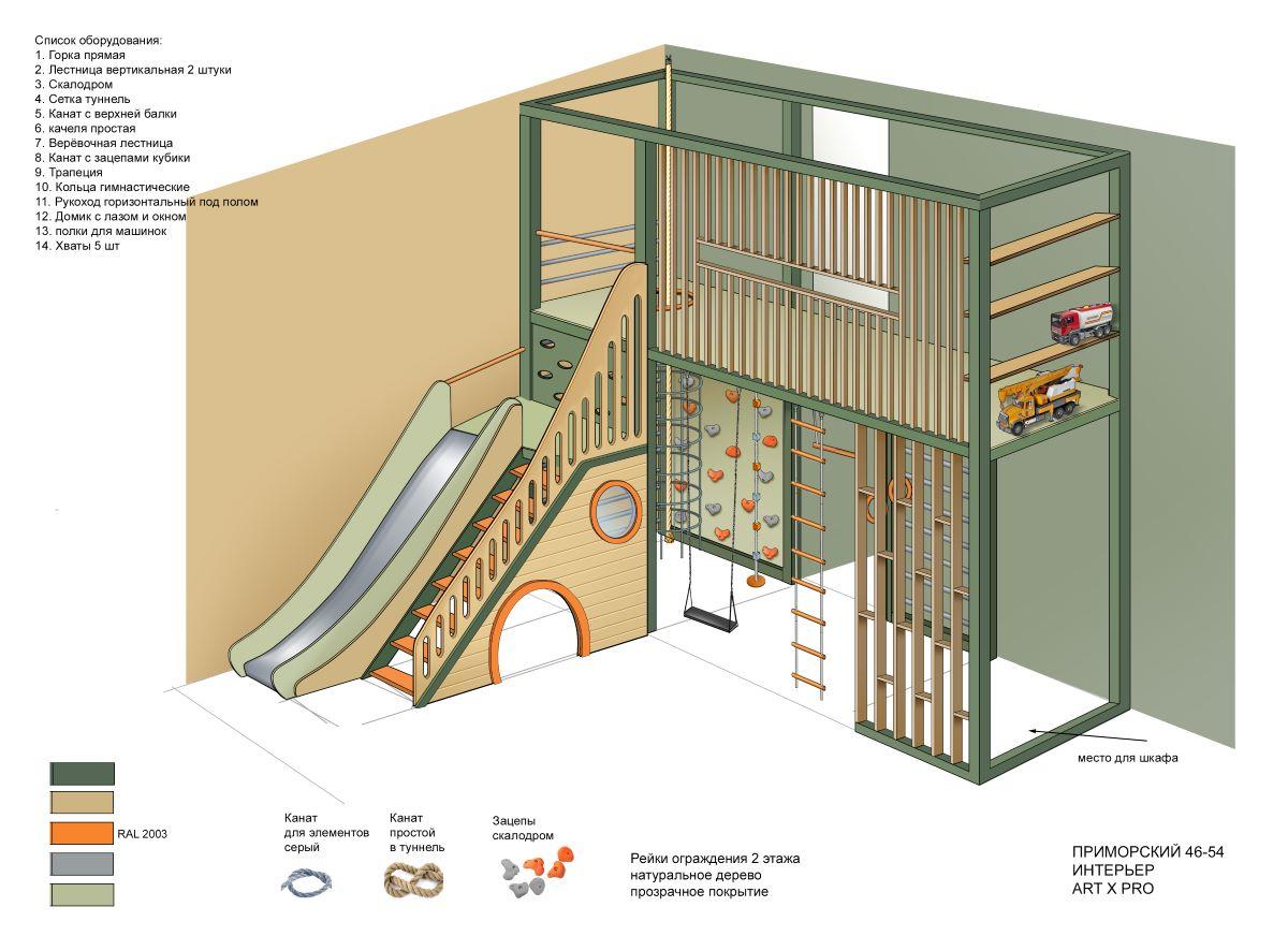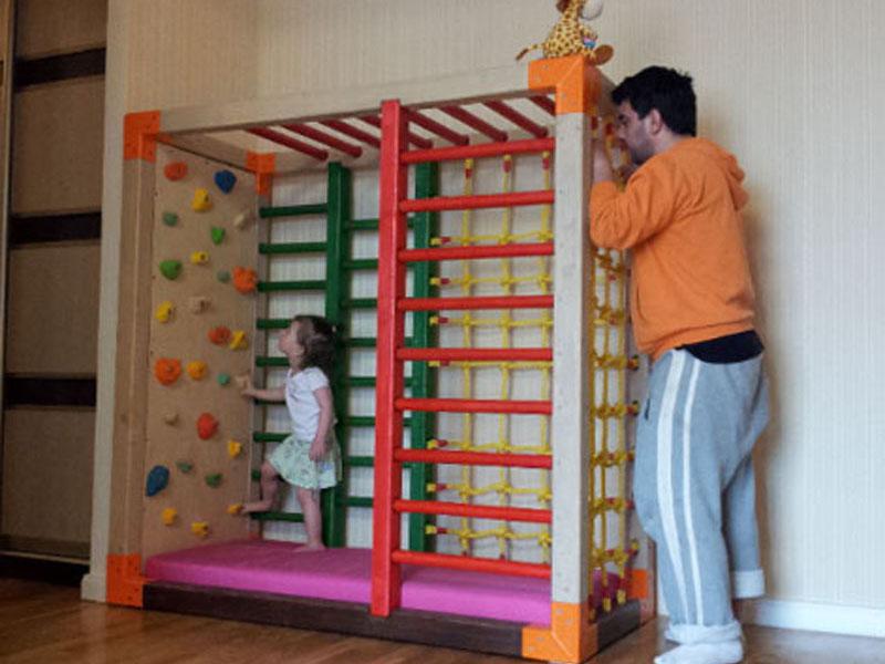 Детские площадки для квартиры могут быть похожи на лаконичный гимнастический зал или вольер для мартышек… Если надо, то потолок будет небом, а паркет газоном. Воображайте дорогие взрослые, оглядывая пока еще пустую комнату, предназначенную для детской. Полистайте журналы, загляните в интернет, посетите зоопарк… Потом звоните нам. Уж мы то развернемся на славу.